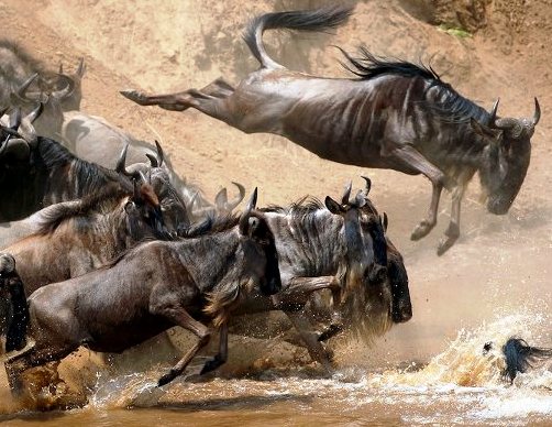 crocodiles, who lay in wait for a meal as the wildebeest cross